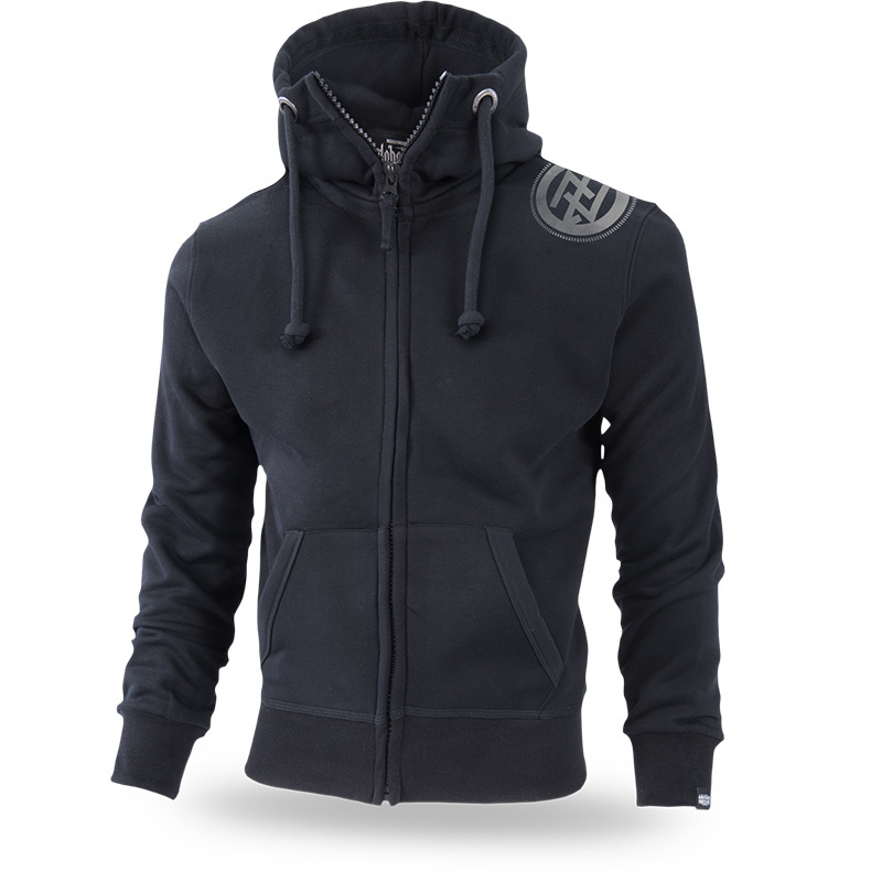 Bawełniana bluza z zamkiem, obszernym kapturem i dwiema naszywanymi kieszeniami. Klasyczny model wykończony wytrzymałymi ściągaczami. Posiada wysoką stójkę. Przy kapturze sznurki i metalowe okucia. Na tyle duży napis Ruthless & Savage, wykonany gotycką czcionką. Pośrodku dwie czaski, a na dole niewielki napis Dobermans Comp. Z przodu na lewym barku znajduje się znak runiczny, symbol kolekcji Offensive.