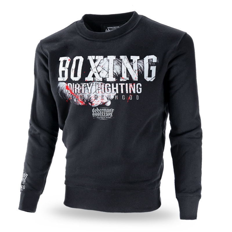 Bawełniana klasyczna bluza zakładana przez głowę. Dół bluzy oraz rękawów wykończono szerokim ściągaczem.Wykonana z wysokiej jakości bawełny. Na lewym rękawie mniejsza z logo marki Dobermans Aggressive. Na prawym rękawie nad nadgarstkiem nadruk z logo marki i napisem BOXING DIRTY FIGHTING. Na przodzie napis BOXING DIRTY FIGHTING i logo marki na tle zaciśniętych pięści bokserskich. Tył gładki, na karku miniatura grafiki znajdującej się na przodzie bluzy.