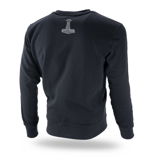 Męska klasyczna bluza zakładana przez głowę. Wykonana z wysokiej jakości bawełny. Dół bluzy oraz rękawy wykończone szerokim ściągaczem. Lewy rękaw z naszytą małą metką Doberman’s Aggressive. Na przodzie grafika przedstawiająca młot Thora i logo marki. Dookoła grafiki czerwone symbole runiczne. Z tyłu na karku, miniaturka grafiki młota Thora.