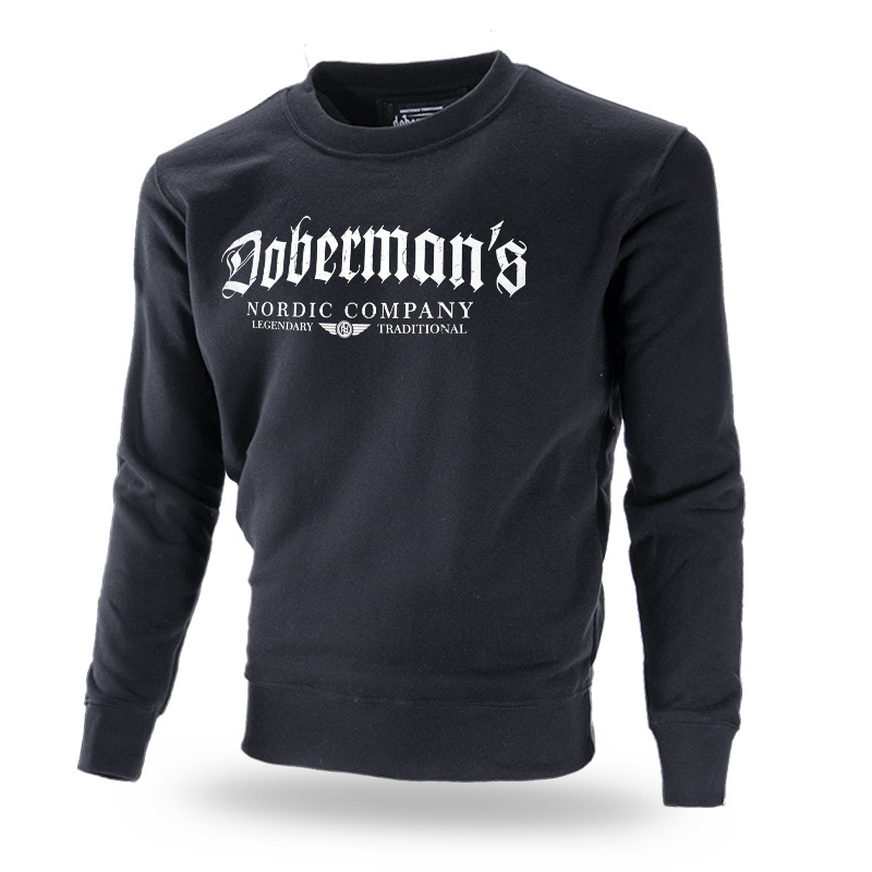 Męska klasyczna bluza zakładana przez głowę. Wykonana z wysokiej jakości bawełny o gramaturze 320g.Na lewym rękawie wszyta mała metka z logo marki. Dół bluzy oraz rękawów wykończone szerokim ściągaczem. Na przodzie bluzy znajduje się duzy napis Dobermans wykonany czcionka gotycka. Wzór uzupełnia dodatkowy tekst poniżej, oraz symbole nordyckie.
