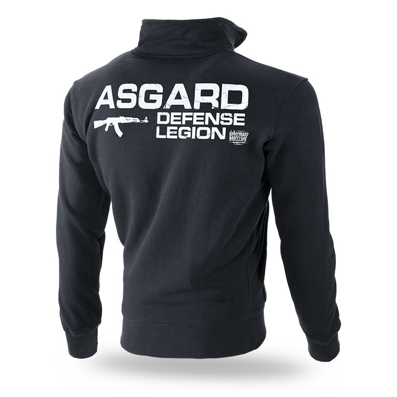 Model bluzy z zamkiem oraz wysokim kołnierzem. Dwie kieszenie na froncie, na lewym rękawie mała metka z logo Dobermans Aggressive. Dół bluzy i rękawy zakończone mocnymi ściągaczami. Bluza wykonana została z wysokiej jakości bawełny. Model Asgard z napisem na plecach „Asgard Defense Legion” W tekst skierowana jest strzelba, grafikę dopełnia logo marki Doberman’s z przodu nadruk w mniejszym formacie.