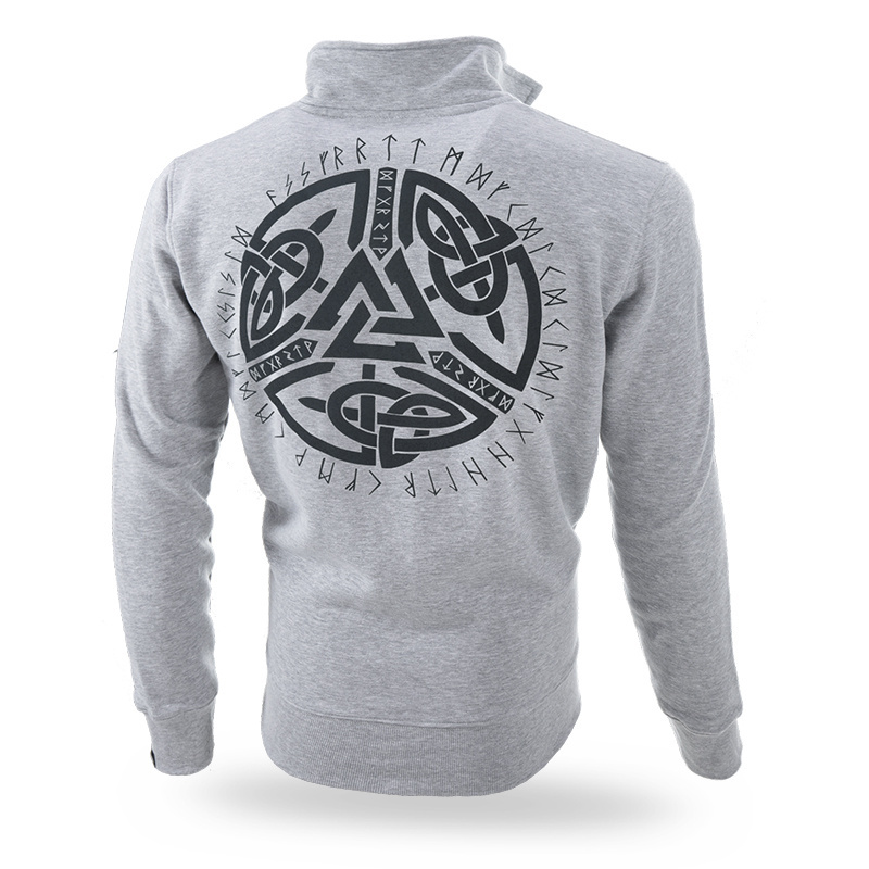 Model bluzy z zamkiem oraz wysokim kołnierzem. Dwie kieszenie na froncie, na lewym rękawie mała metka z logo Dobermans Aggressive. Dół bluzy i rękawy zakończone mocnymi ściągaczami. Bluza wykonana została z wysokiej jakości bawełny. Na przodzie bluzy znajduje się mała haftowana naszywka z nordyckim symbolem. Tył bluzy ozdabia duża grafika w stylu nordyckim wykonana metodą druku wypukłego.