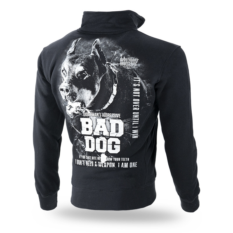 Model bluzy z zamkiem oraz wysokim kołnierzem. Dwie kieszenie na froncie, na lewym rękawie mała metka z logo Doberman’s Aggressive.Dół bluzy i rękawy zakończone mocnymi ściągaczami. Bluza wykonana została z wysokiej jakości bawełny. Model Bad Dog przedstawia wściekłego Dobermana, poniżej duży napis „Bad Dog”. Z przodu bluzy napis „Bad Dog” oraz logo marki.