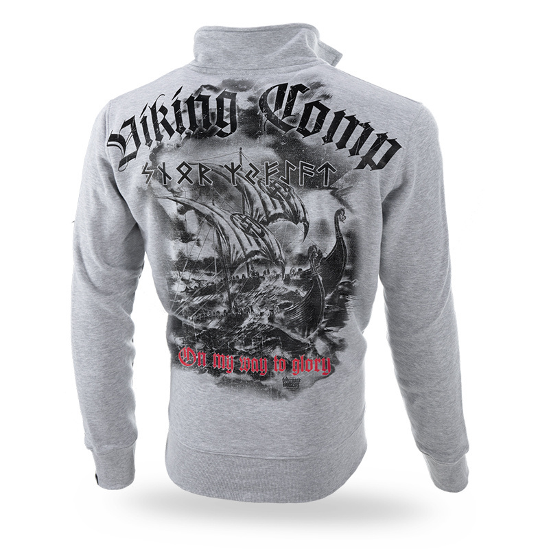 Dół bluzy i rękawy zakończone mocnymi ściągaczami. Na lewej piersi niewielki napis Viking Comp oraz runiczny symbol. Plecy w znaczącym stopniu pokrywa nadruk. Grafika przedstawia łodzie Vikingów na wzburzonym morzu. Powyżej znajduje się duży napis Viking Comp oraz symbole runiczne. Wzór nawiązujący do linii Viking.