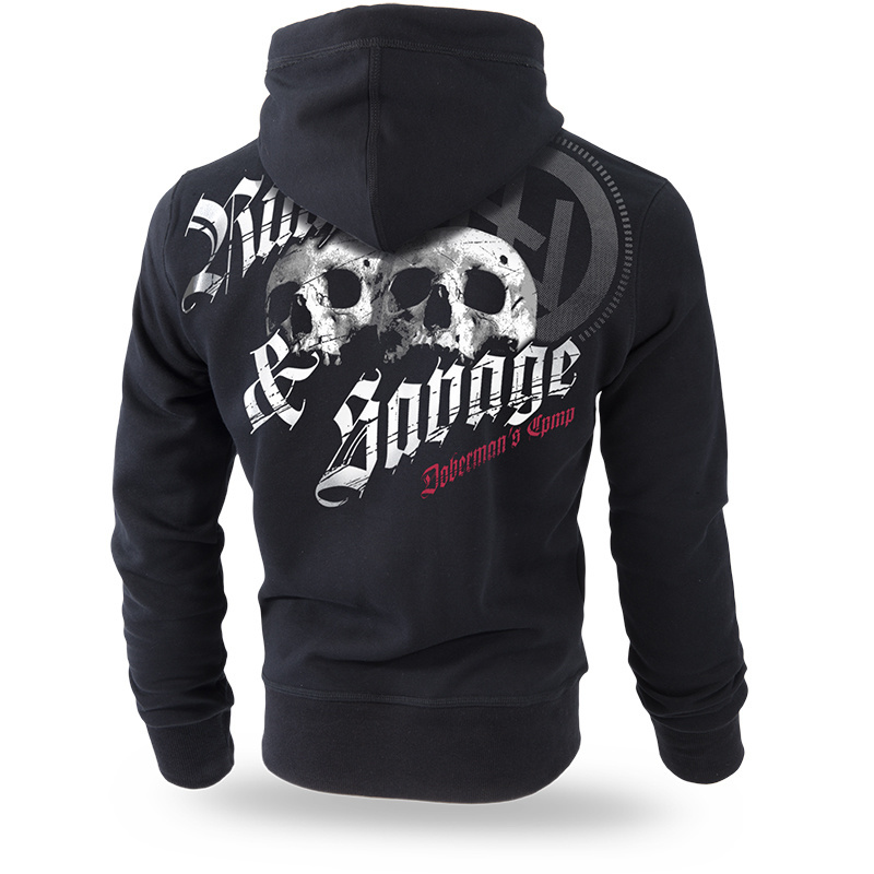 Męska bluza typu kangurka, posiada kieszeń na przodzie. Obszerny kaptur w prosty sposób można regulować sznurkami.Odzież uszyto z wysokiej jakości bawełny o masie 320g. Dół bluzy oraz rękawów wykończony został szerokim ściągaczem. Na lewym rękawie znajduje się mała metka z logo marki. Plecy bluzy częściowo pokrywa nadruk przedstawiający dwie czaszki oraz duży napis Ruthless & Savage. Pod spodem niewielki napis Dobermans Comp. Z przodu, na lewym ramieniu nadrukowano koło ze znakiem runicznym.