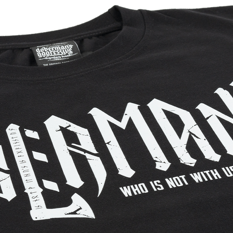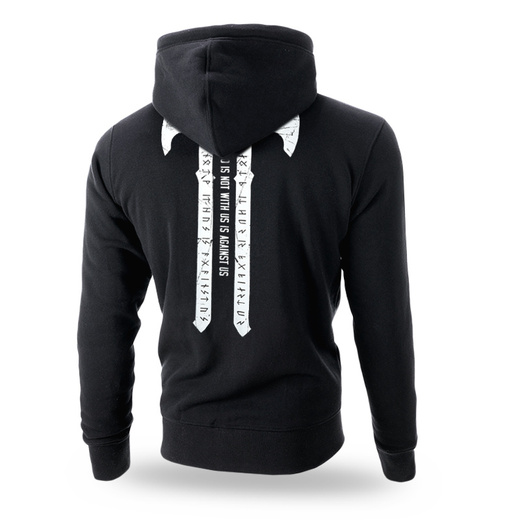 Kangurka z bardzo wysokiej jakości bawełny, wykończona grubymi sznurkami przy szyi, metalowymi okuciami i wszytą kieszenią na brzuchu.Na przodzie bluzy znajduję się duży napis Doberman’s w stylu runicznym , na plechach grafika przedstawia dwa topory z wkomponowanymi runami . Całość grafiki zamyka małe logo marki Doberman’s.