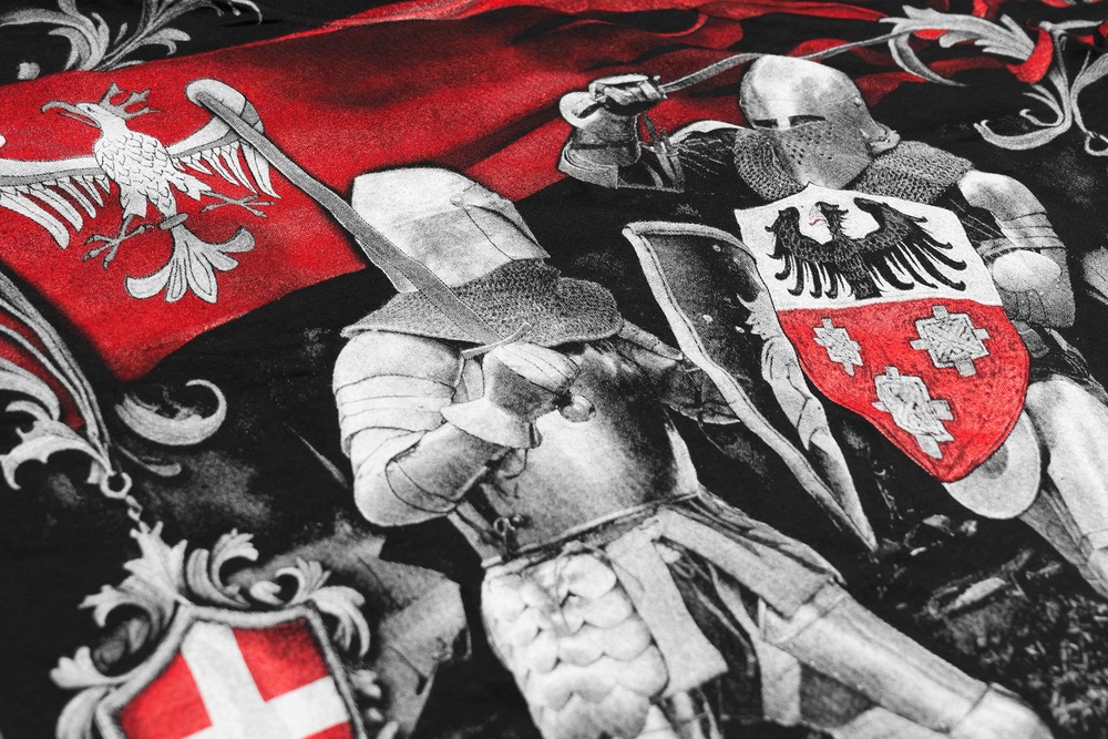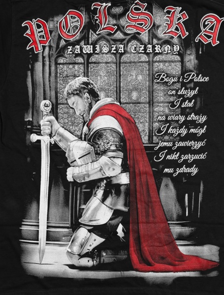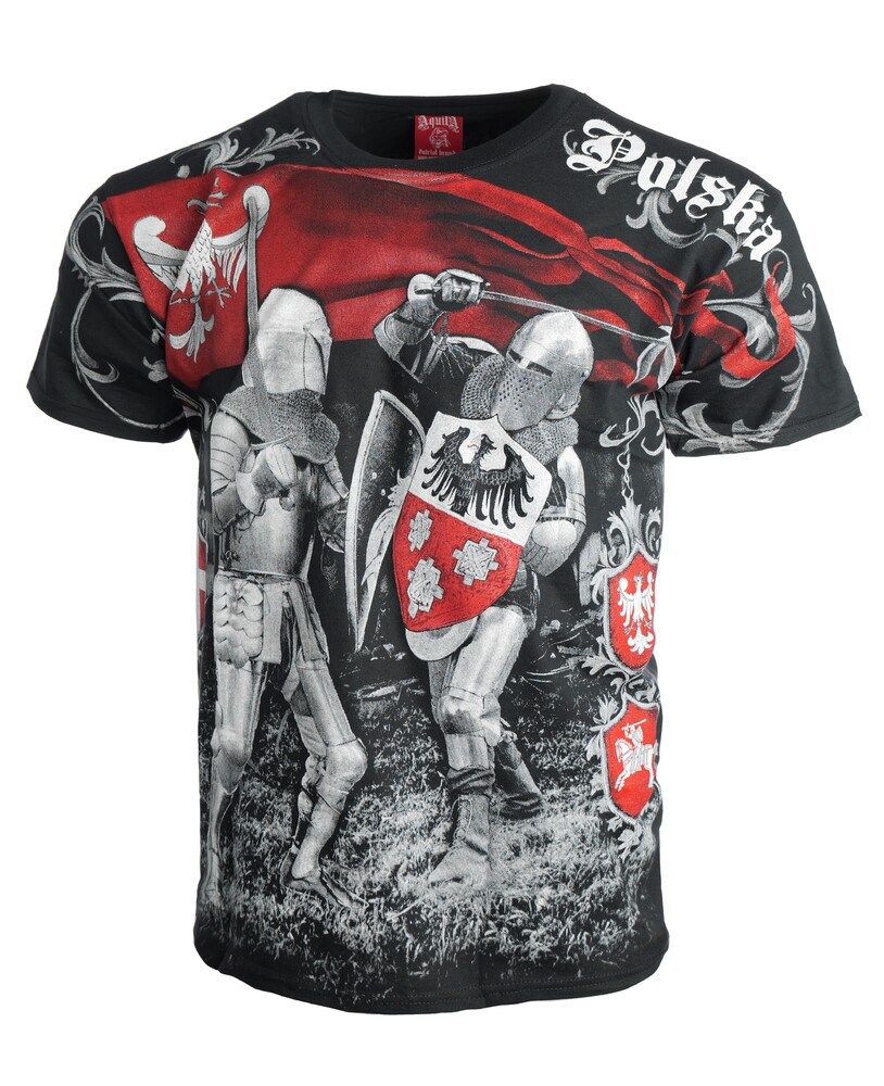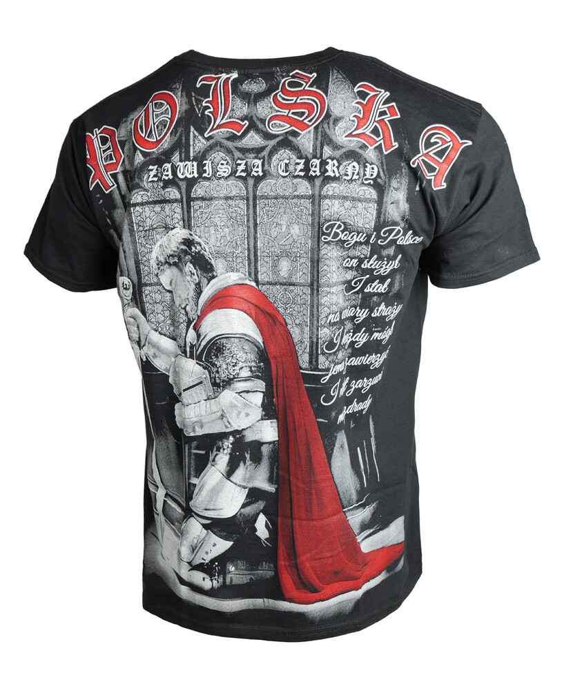 Wyjątkowa koszulka patriotyczna z motywem Turnieju Rycerskiego. Wykonana z czarnej, wysokogatunkowej bawełny przez polskiego producenta odzieży - Aquila. Podczas projektowania oraz wykonania koszulki zadbano o jej najdrobniejsze detale. Nadruk na koszulce wykonany został przy pomocy sitodruku. Jest bardzo trwały i nie ulega zniszczeniu podczas użytkowania. Produkt należy prać w temperaturze nie przekraczającej 40 stopni, pozwoli to zdecydowanie dłużej zachować trałość nadruku.