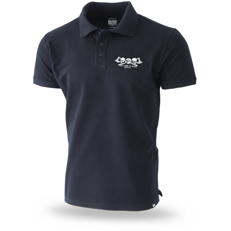 Męska koszulka polo z krótkim rękawkiem. Wykonana z wysokiej jakości bawełny. Na lewym rękawku mała metka z logo Doberman’s Aggressive. Na plecach dwukolorowa grafika z napisem Viking Comp, trzema czaszkami i toporami oraz napisem „That’s where we belong Valhalla”. Z przodu na lewej piersi, miniaturka grafiki znajdującej się z tyłu koszulki.