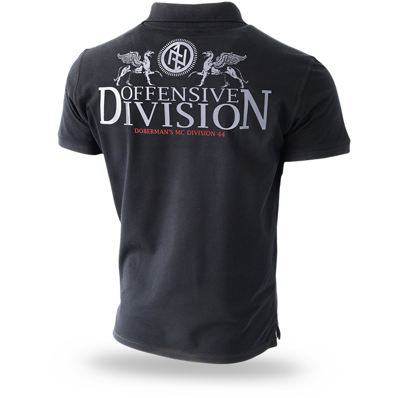 Koszulka z krótkim rękawem, fason polo. Posiada kołnierzyk zapinany na trzy guziki. Odzież została wykonana z wysokiej jakości bawełny o masie 200g. Rękawki wykończone wąskim ściągaczem. Koszulkę polo zdobi delikatny, ale bardzo charakterystyczny nadruk w postaci napisu DIVISION OFFENSIVE. Nad napisem znajdują się dwa mityczne stworzenia ze skrzydłami. Nordycki znak zamknięty w kole nadaje całości charakteru. Na lewej piersi mały nadruk w kształcie koła.