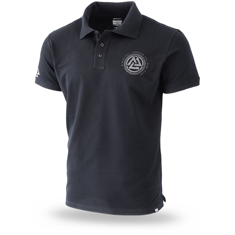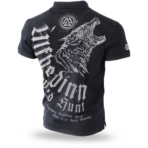 Świetnej jakości bawełniana polówka, zapinana na 3 guziki pod szyją i ze ściągaczem na rękawach. Materiał to 100% bawełna o gramaturze 200g. Na prawym rękawku wyhaftowany znak runiczny Valknut, związany z mitologią nordycką, oznaczający poległych z mieczem w ręku. Na lewej piersi powtórzony symbol Valknut w formie nadruku z efektem przyniszczenia. Na plecach duży napis w stylu gotyckim oraz wściekły wilk z otwartą paszczą.