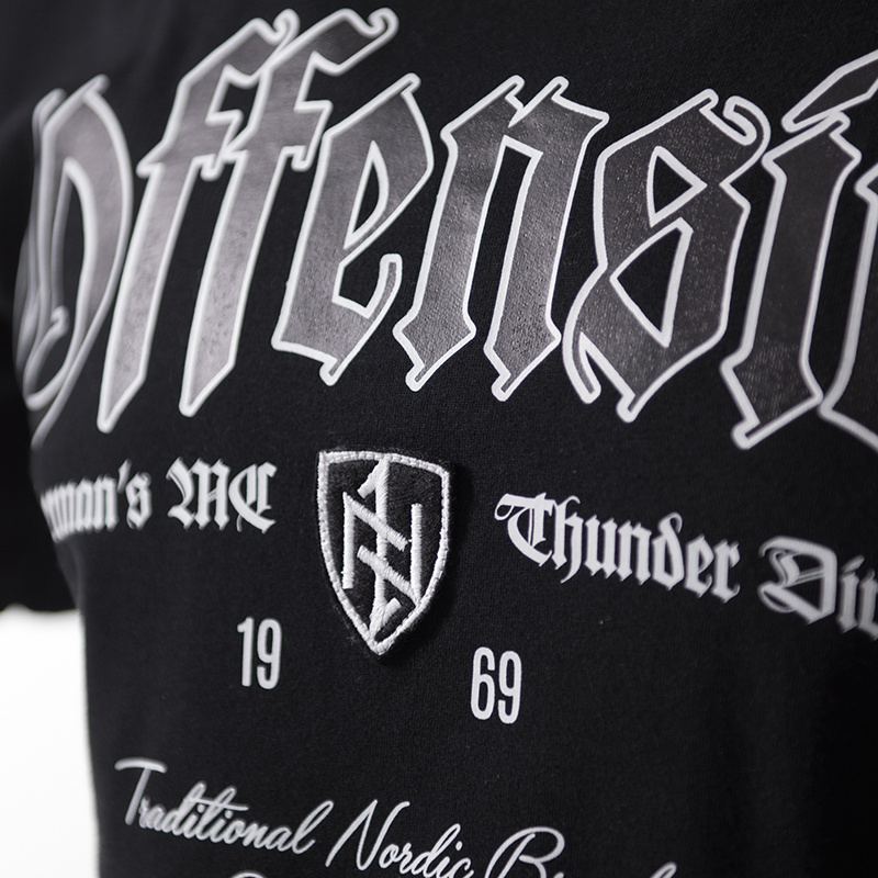 Świetnej jakości bawełniana polówka, zapinana na 3 guziki pod szyją i ze ściągaczem na rękawach. Materiał to 100% bawełna o gramaturze 200g. Na plecach duży napis Offensive w stylu gotyckim. Poniżej na środku naszywka z wyhaftowaną tarczą z runami, nawiązująca do wierzeń nordyckich. Po bokach napisy w tym samym stylu. Pod spodem hasło i trzy pioruny. Z przodu powtórzony motyw piorunów, tyle że wyhaftowany, co nadaje charakteru całości.