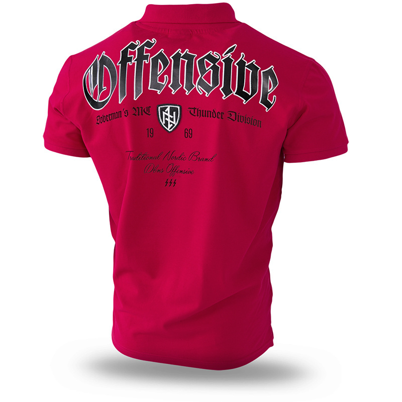 Świetnej jakości bawełniana polówka, zapinana na 3 guziki pod szyją i ze ściągaczem na rękawach. Materiał to 100% bawełna o gramaturze 200g. Na plecach duży napis Offensive w stylu gotyckim. Poniżej na środku naszywka z wyhaftowaną tarczą z runami, nawiązująca do wierzeń nordyckich. Po bokach napisy w tym samym stylu. Pod spodem hasło i trzy pioruny. Z przodu powtórzony motyw piorunów, tyle że wyhaftowany, co nadaje charakteru całości.