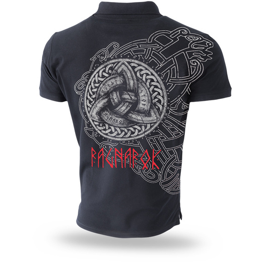 Koszulka polo wykonana z bawełny wysokiego gatunku.Standardowy fason męski, materiał to 100% bawełny o gramaturze 200g. T-shirt zapinany na trzy guziki przy szyi, posiada kołnierzyk oraz ściągacz przy rękawkach. Na lewym barku nadruk Ragnarok wzdłuż szwu. Na tyle grafika z celtyckim symbolem połączenia oraz motywy skandynawskie. Nadruk w dwóch kolorach.
