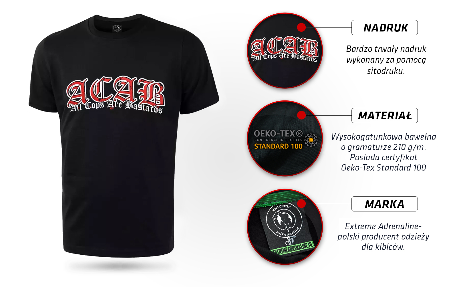 Kibicowska koszulka acab wykonana przez polskiego producenta odzieży dla kibiców - Extreme Adrenaline. Podczas projektowania oraz wykonania koszulki zadbano o jej najdrobniejsze detale. Nadruk na koszulce wykonany został przy pomocy sitodruku. Jest bardzo trwały i nie ulega zniszczeniu podczas użytkowania. Produkt należy prać w temperaturze nieprzekraczającej 40 stopni, pozwoli to zdecydowanie dłużej zachować trwałość nadruku.