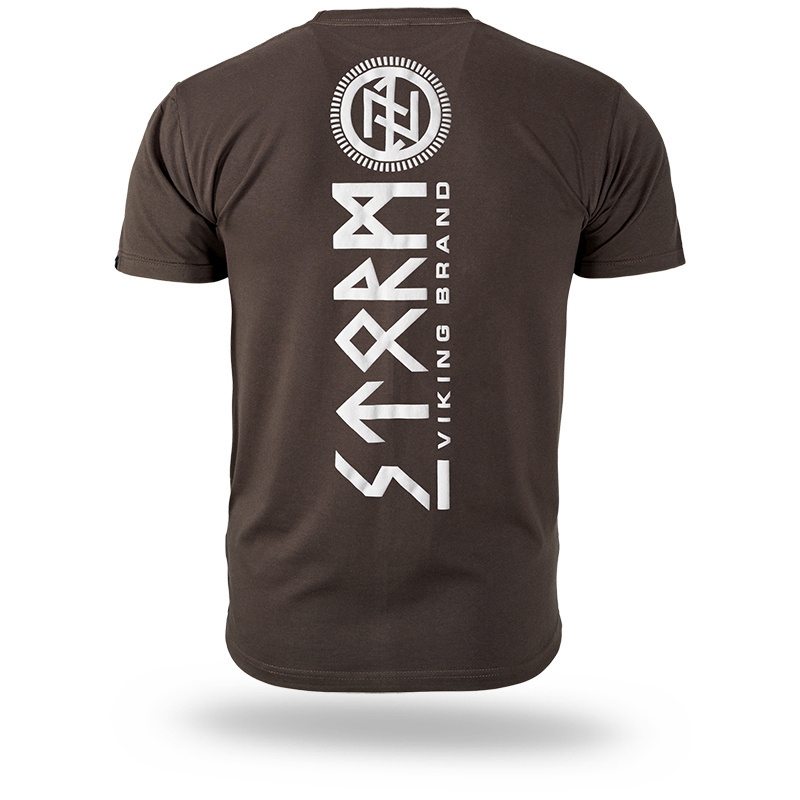Koszulka męska z krótkim rękawem w klasycznym fasonie.Odzież wykonana z bawełny o gramaturze 200g. Na lewym rękawku mała metka z logo Doberman’s Aggressive. Na plecach znajduję się napis STORM VIKING BRAND, oraz symbol nordycki wykonany metodą druku puchnącego. Z przodu koszulki na piersi mniejsza grafika nawiązująca do głównego motywu.