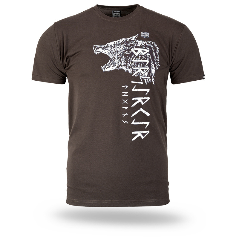Koszulka męska z krótkim rękawem w klasycznym fasonie. Odzież wykonana z bawełny o gramaturze 200g. Na lewym rękawku mała metka z logo Doberman’s Aggressive. Z przodu koszulki grafika przedstawiająca głowę wilka z otwartą paszczą. Całość uzupełnia napis BERSERKER wykonany wzdłuż koszulki, oraz małe logo marki.