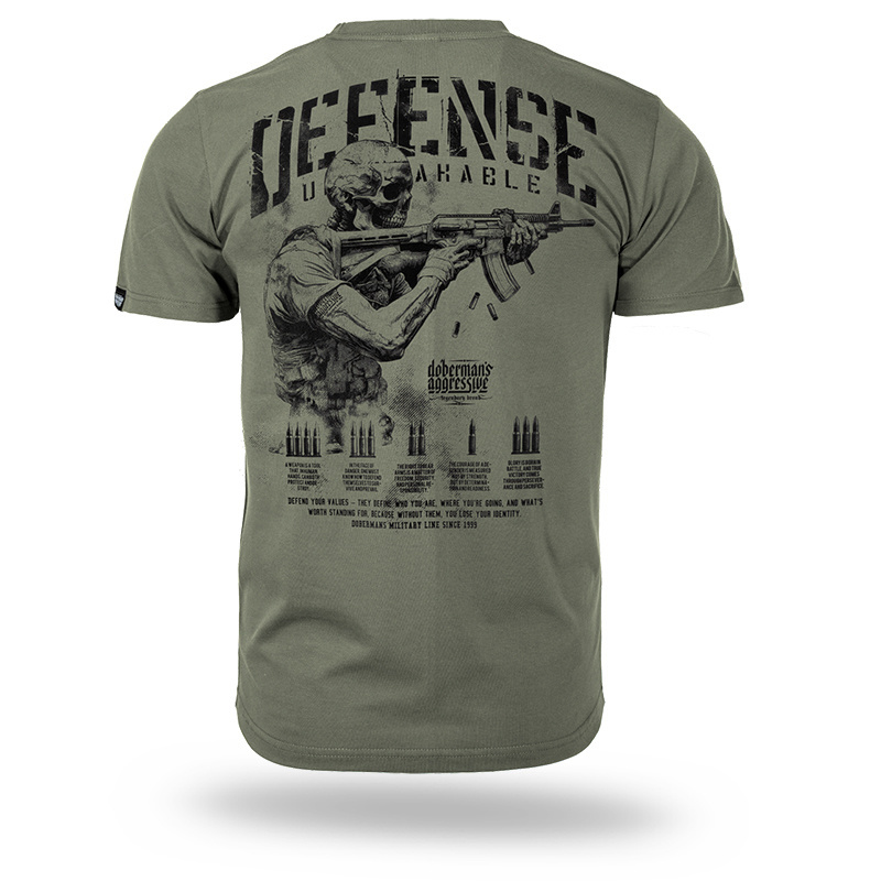 Wykonany z wysokiej jakości bawełny, zapewniającej komfort noszenia. Na plecach duży, szczegółowy nadruk przedstawiający uzbrojonego wojownika z czaszką, dynamicznie otoczonego łuskami amunicji. Powyżej hasło "DEFENSE UNBREAKABLE". Na dole dodatkowe elementy graficzne, w tym naboje i tekst inspirowany motywem obrony i wartości. Z przodu, na lewej piersi, mały nadruk w formie trzech pocisków i logotypu.