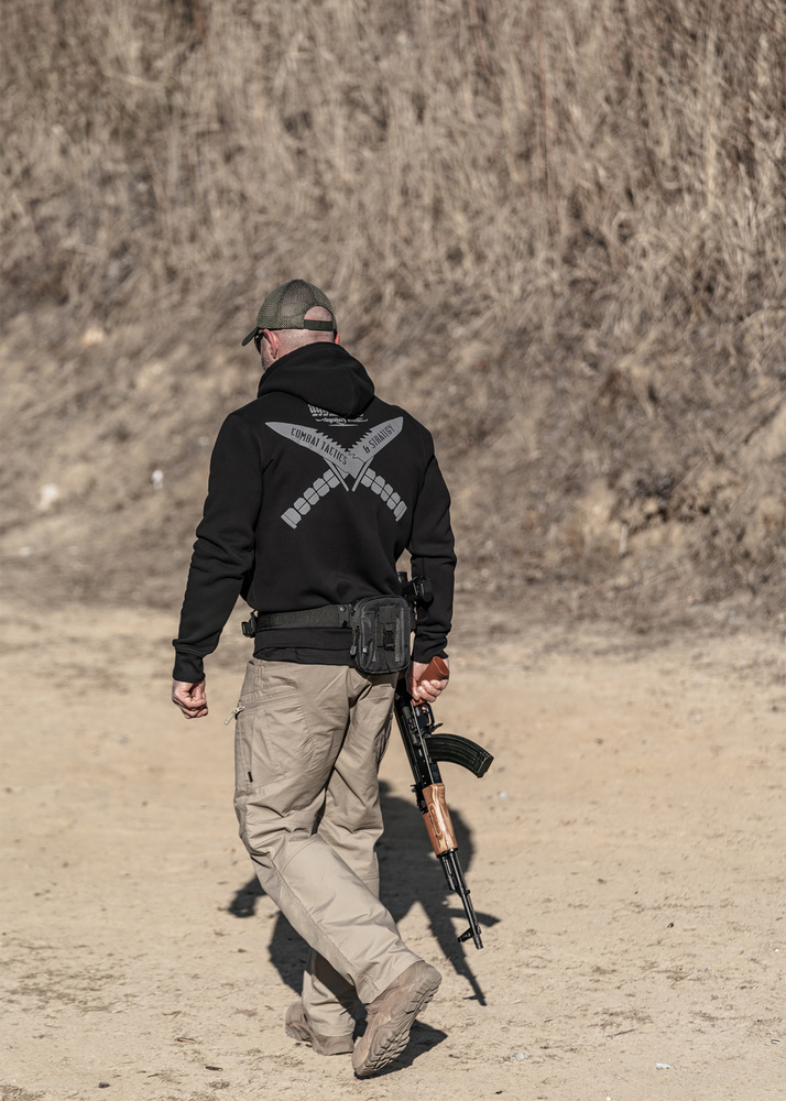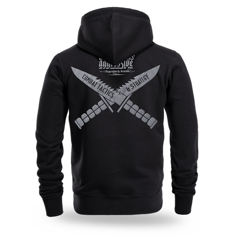 Wykonana z wysokiej jakości bawełny, zapewniającej komfort noszenia. Na plecach duży nadruk wykonany metodą 3D druku puchnącego, przedstawiający skrzyżowane taktyczne noże z ostrzami skierowanymi ku górze oraz napis "COMBAT TACTICS & STRATEGY". Nad grafiką logo marki "DOBERMANS AGGRESSIVE". Przód bluzy gładki, bez nadruku.
