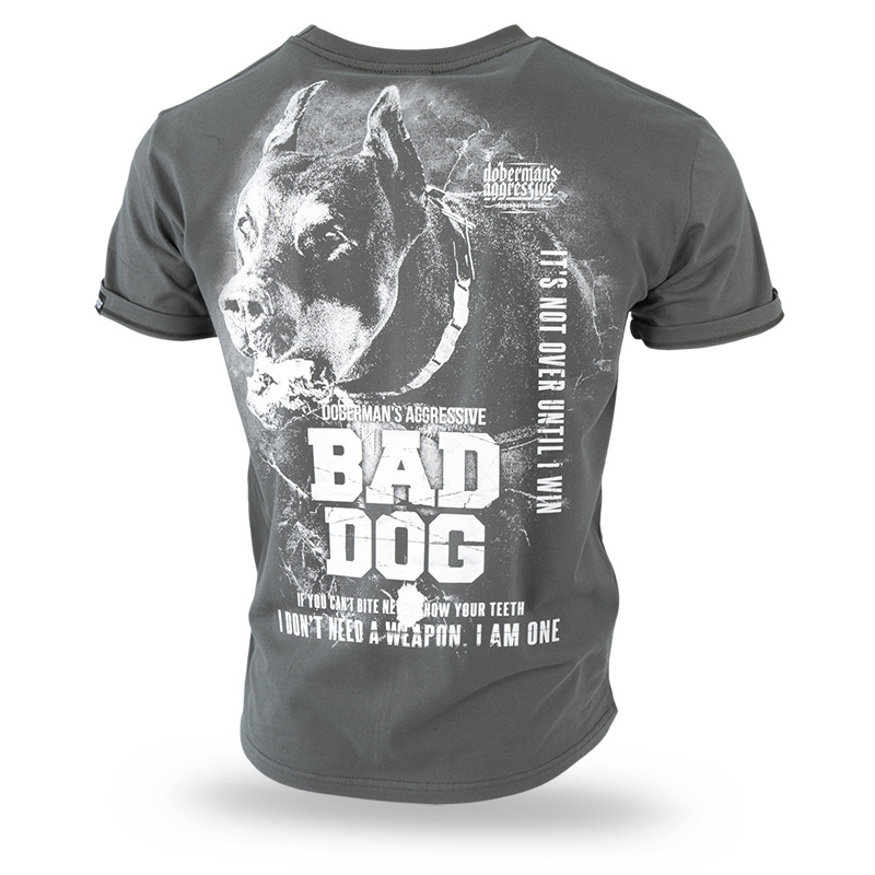 Wykonana z bawełny o wysokiej gramaturze. Na lewym rękawie wszyta mała metka z logo marki. Model Bad Dog przedstawia wściekłego Dobermana, poniżej duży napis „Bad Dog”. Z przodu koszulki napis „Bad Dog” oraz logo marki.