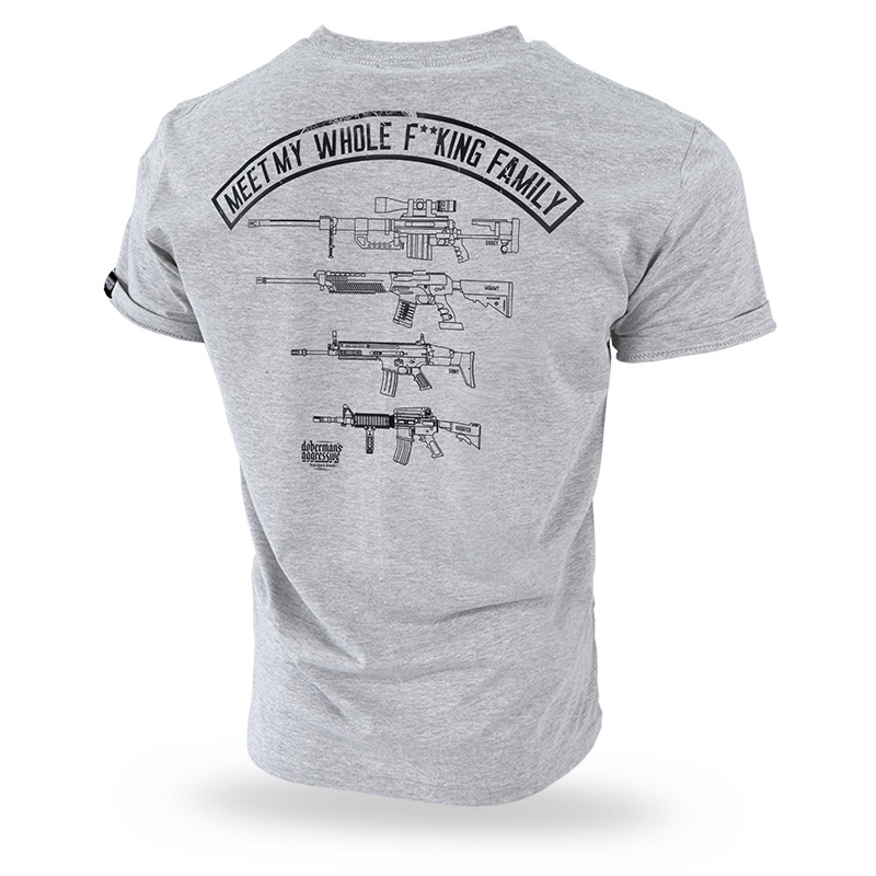 Wykonana z bawełny o wysokiej gramaturze. Na lewym rękawie wszyta mała metka z logo marki. Z tyłu koszulki znajduje się nadruk z karabinami, które obrazują rodzinę dopełnia to napis „Meet My Whole F**king Family” oraz małe logo marki Doberman’s.