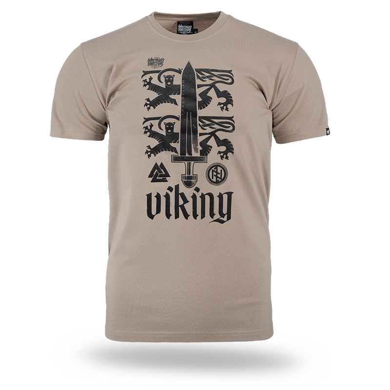 Koszulka wykonana z wysokiej jakości bawełny, zapewniającej komfort noszenia. Na froncie znajduje się duży nadruk przedstawiający skandynawski miecz na tle heraldycznych lwów, a także nordyckie symbole oraz napis "Viking" w stylizowanej czcionce.