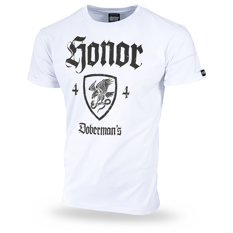 Na lewym rękawku mała metka z logo Doberman’s Aggressive. Na przodzie znajduje się nadruk 3D. Napis „HONOR” poniżej symbol orła chwytającego w swe szpony węża oraz napis „DOBERMA’S”. Dzięki wypukłej grafice koszulka wygląda bardzo efektownie.