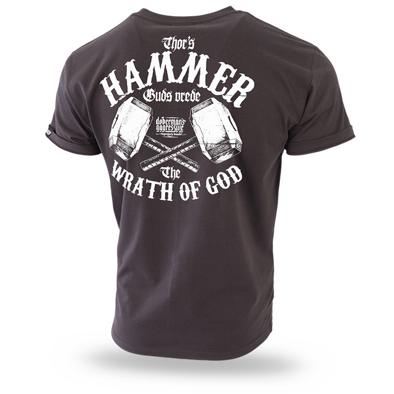 Z tyłu koszulki nadruk przedstawiający skrzyżowane młoty THOR’A oraz napis HAMMER WRATH OF GOD i mniejsze logo marki DOBERMAN’S. Na lewej piersi powielenie nadruku znajdującego się z tyłu w mniejszym formacie.