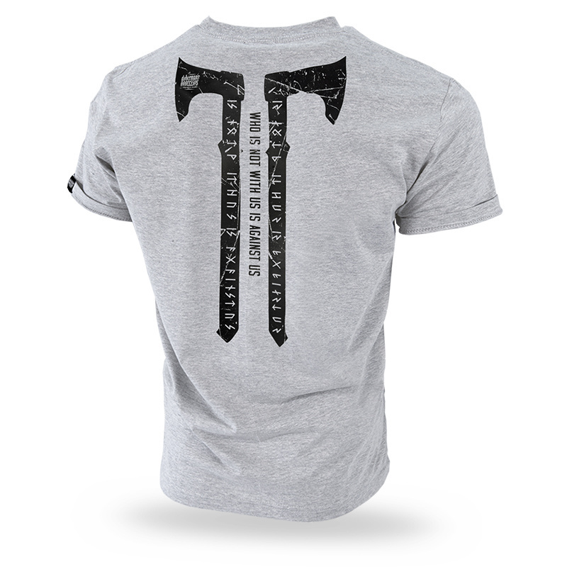 Męska koszulka w standardowym fasonie. Wykonana z wysokiej jakości bawełny. Na przodzie koszulki znajduję się duży napis Doberman’s w stylu runicznym , na plechach grafika przedstawiająca dwa topory z wkomponowanymi runami . Całość grafiki zamyka małe logo marki Doberman’s.