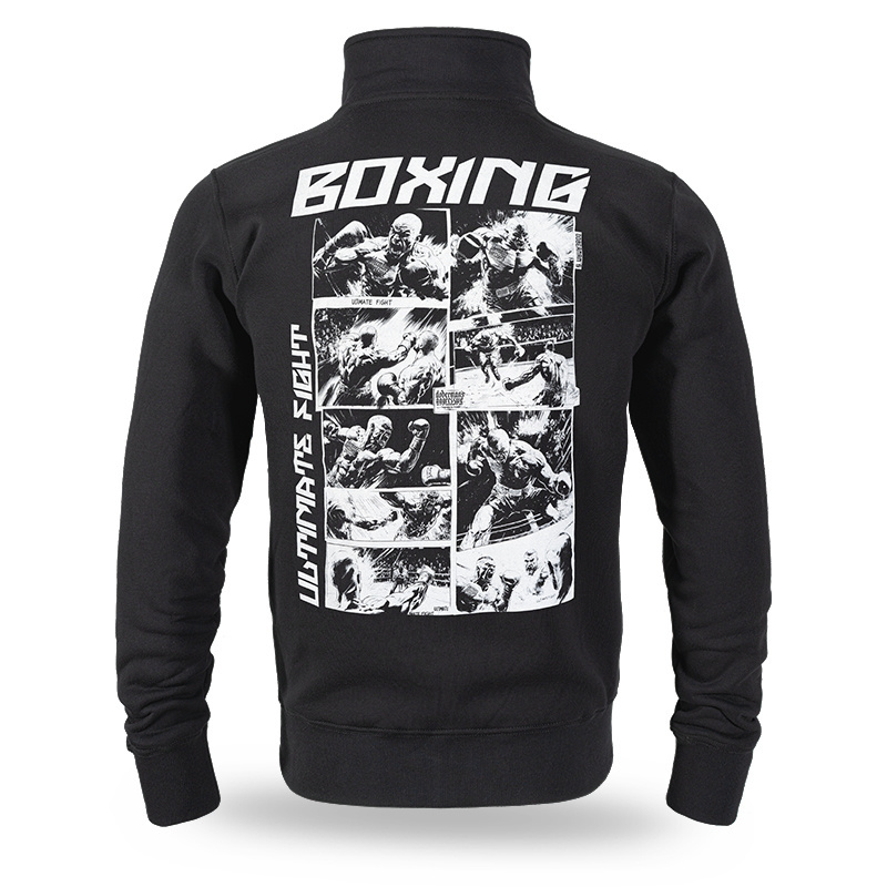 Wykonana z wysokiej jakości materiału, zapewniającego komfort i trwałość. Na plecach umieszczono duży, efektowny nadruk w stylu komiksowym, przedstawiający dynamiczne sceny bokserskie. Przód ozdobiony minimalistycznym nadrukiem z nazwą kolekcji i logo producenta. Bluza posiada zamek błyskawiczny na całej długości oraz praktyczne kieszenie. Krój zapewnia wygodę i swobodę ruchu. Idealna dla miłośników sportów walki oraz wyrazistych, graficznych wzorów.
