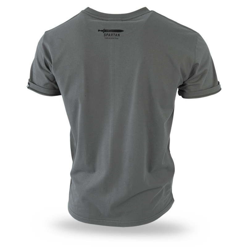 Męska koszulka w standardowym fasonie. Wykonana z wysokiej jakości bawełny. Na lewym rękawie wszyta mała metka z logo marki. Na przodzie znajduje się grafika przedstawiająca hełm oraz miecz spartan z dużym napisem SPARTAN FOR THE GLORY. Z tyłu znajduje się mała grafika nawiązująca do przodu koszulki .