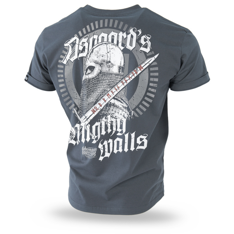 Męska koszulka w standardowym fasonie. Wykonana z wysokiej jakości bawełny. Na lewym rękawku wszyta mała metka z logo marki. Na plecach grafika przedstawiająca Wikinga trzymającego miecz ozdobiona elementami nordyckimi. Z przodu na lewej piersi znajduje się napis Asgaard’s mighty walls.