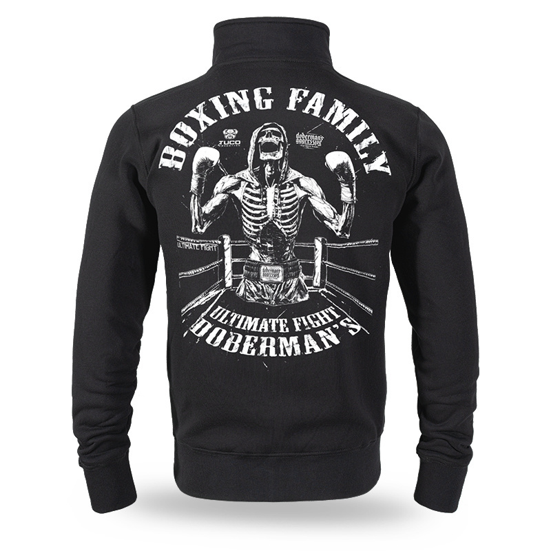 Model inspirowany sportami walki. Na froncie niewielka grafika z motywem "Boxing Family" umieszczona na lewej piersi. Tył zdobi duży, szczegółowy nadruk przedstawiający boksera o szkieletowej sylwetce stojącego w ringu. Grafika wzbogacona o hasła "Ultimate Fight" i "Doberman’s". Bluza posiada praktyczne kieszenie z przodu oraz ściągacze na rękawach i u dołu.