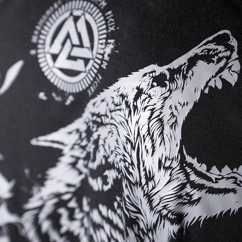 T-shirt Dobermans Ulfhedinn posiada wąski ściągacz przy szyi oraz małą metkę z logo producenta na lewym rękawie. W środku na karku wszyta jest metka żakardowa.