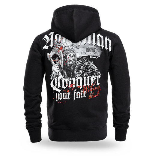 Wykonana z wysokiej jakości bawełny, posiada dwie kieszenie z przodu, wykończona ściągaczami. Na lewym rękawie mała metka z logo marki. Kaptur ozdobiony grubym sznurkiem oraz okuciami z logo marki. Na plecach znajduję się duża grafika Vikinga trzymającego topór, całość uzupełnia napis Northman Conquer your fate. Z przodu bluzy mniejsza grafika nawiązująca do głównego motywu.