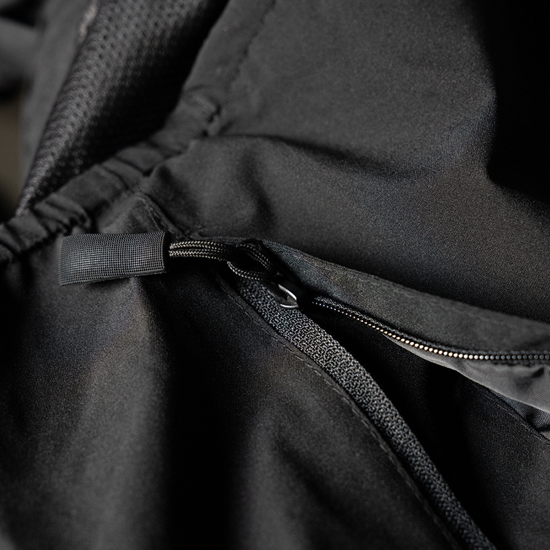 Męska kurtka sportowa zapinana na zamek, z regulowanym, odpinanym kapturem i wysokim kołnierzem.