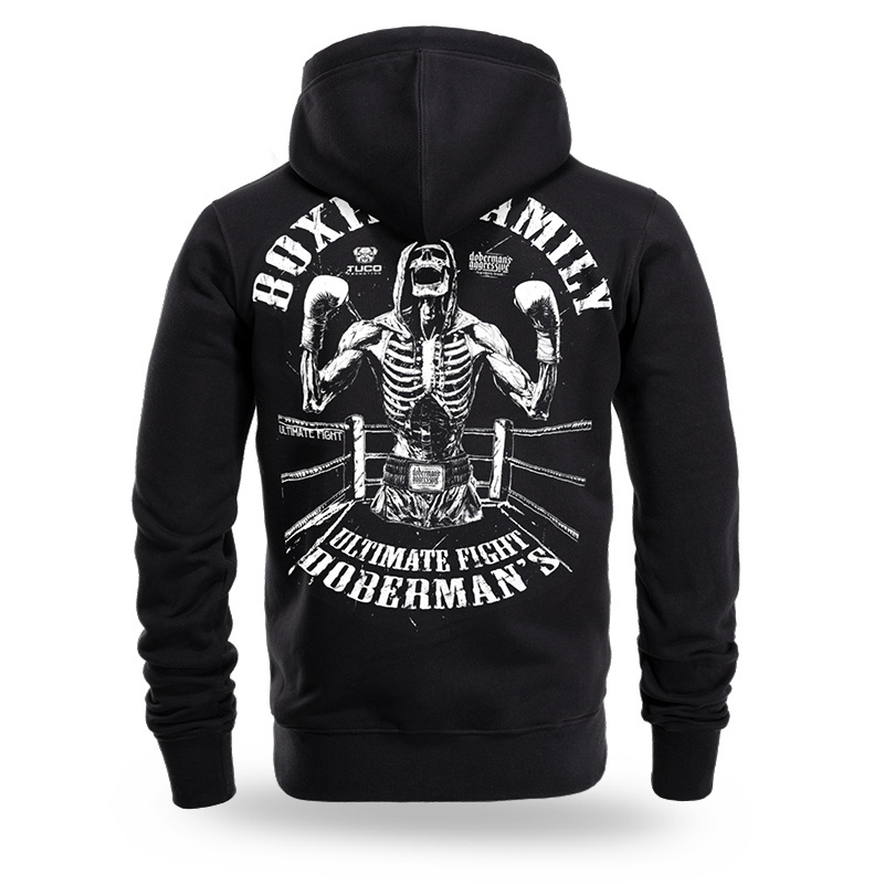 Klasyczna bluza sportowa z regulowanym kapturem i kieszenią typu kangurka. Na froncie małe logo Boxing Family, natomiast na plecach duży, efektowny nadruk przedstawiający szkielet boksera na ringu, otoczony napisami 'Boxing Family', 'Ultimate Fight' oraz 'Doberman’s'. Ściągacze na rękawach i u dołu zapewniają dobre dopasowanie.