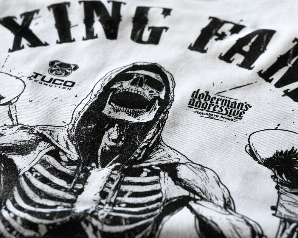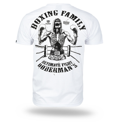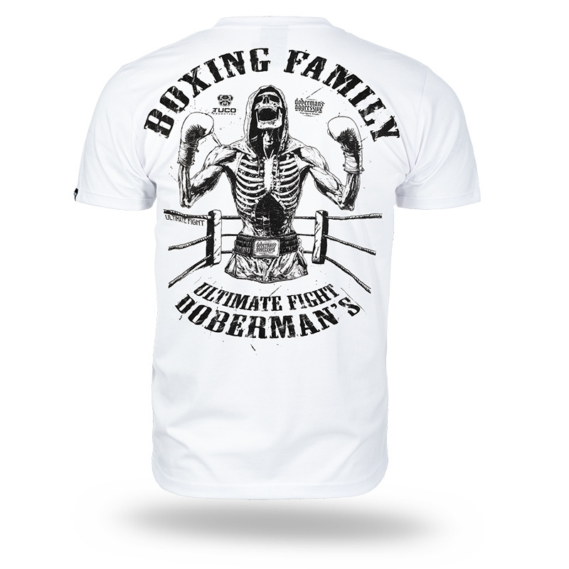 Model inspirowany sportami walki. Na plecach znajduje się duży nadruk przedstawiający szkielet boksera w ringu oraz hasła "BOXING FAMILY", "ULTIMATE FIGHT" i "DOBERMAN'S". Przód ozdobiony małym nadrukiem na piersi z grafiką i napisem "BOXING FAMILY". Koszulka wykonana z wysokiej jakości bawełny, zapewniającej komfort noszenia i trwałość.