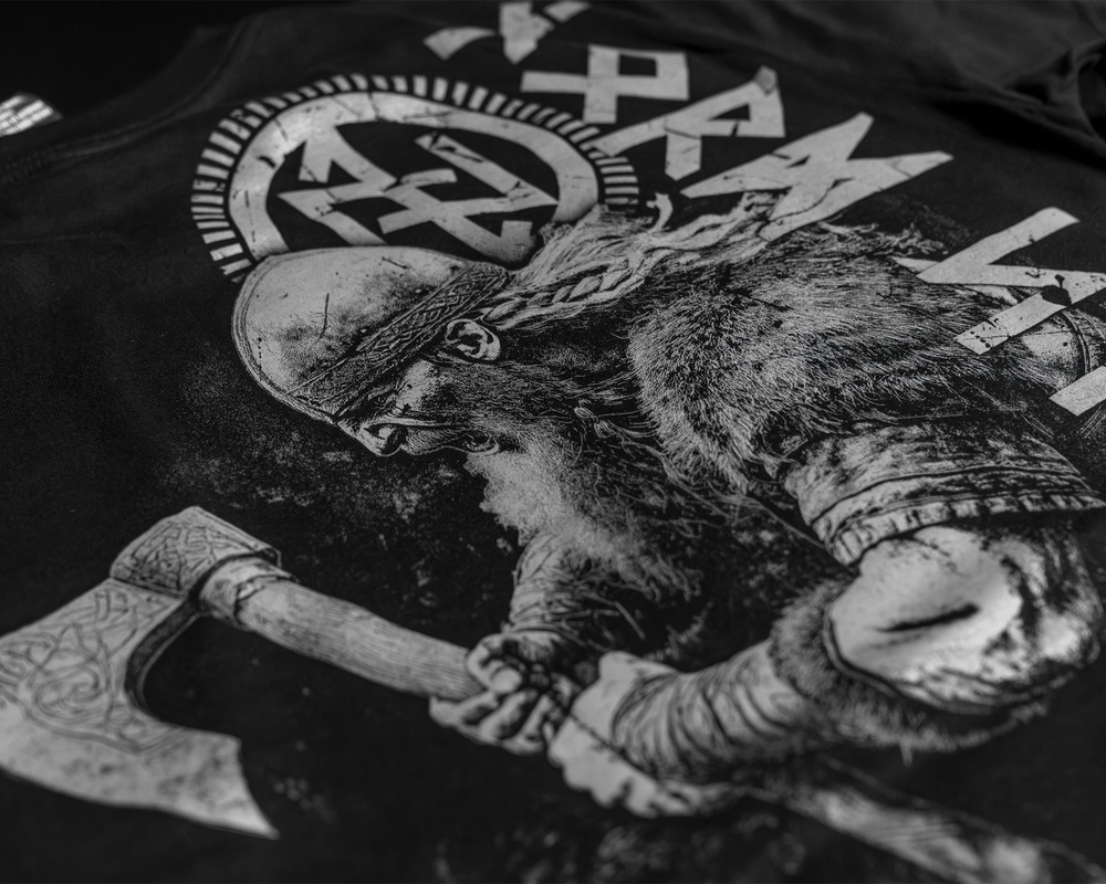 Klasyczna koszulka wykonana z wysokiej jakości bawełny. Na plecach umieszczono duży, szczegółowy nadruk przedstawiający wikinga w bitewnej pozie, dzierżącego topór. Towarzyszy mu nordycki symbol oraz napis w stylizowanych runach. Na przodzie, po lewej stronie klatki piersiowej, znajduje się minimalistyczny napis "STORM".