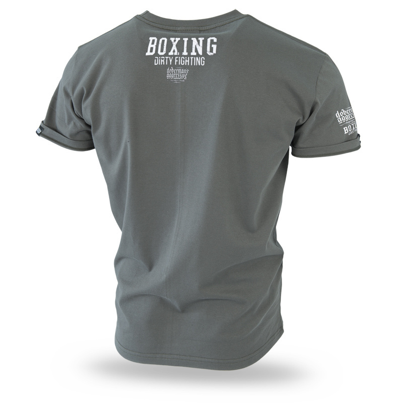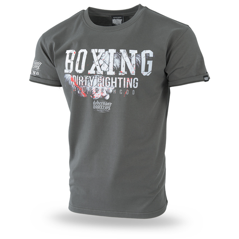 Męska koszulka o klasycznym kroju z krótkim rękawem. Wykonana z najwyższej jakości bawełny. Na prawym rękawku nadruk z logo marki i napisem BOXING DIRTY FIGHTING. Lewy rękawek z naszytą małą metką Doberman’s Aggressive. Na przodzie napis BOXING DIRTY FIGHTING i logo marki na tle zaciśniętych pięści bokserskich. Tył gładki, na karku miniatura grafiki znajdującej się na przodzie koszulki.