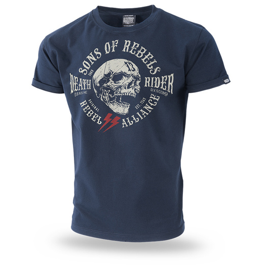 Bawełniana koszulka o klasycznym fasonie. Posiada wąski ściągacz przy szyi który poprawia komfort noszenia. Odzież została wykonana z wysokiej jakości bawełny o gramaturze 200g. Wewnątrz oraz na lewym rękawku znajduje się mała metka z logo Dobermans Aggressive. Na piersi wykonano nadruk w formie koła. Grafika w centrum posiada czaszkę, poniżej dwa pioruny. Dookoła znajdują się hasła Sons of Rebels i Rebel Alliance. Z tyłu na karczku powielenie nadruku w mniejszej skali.
