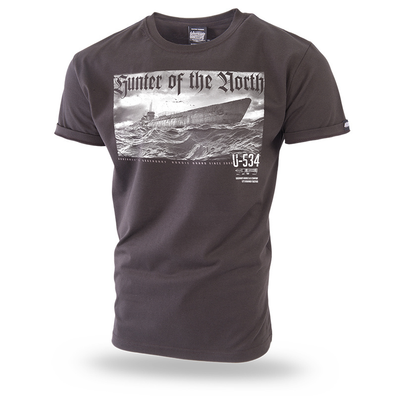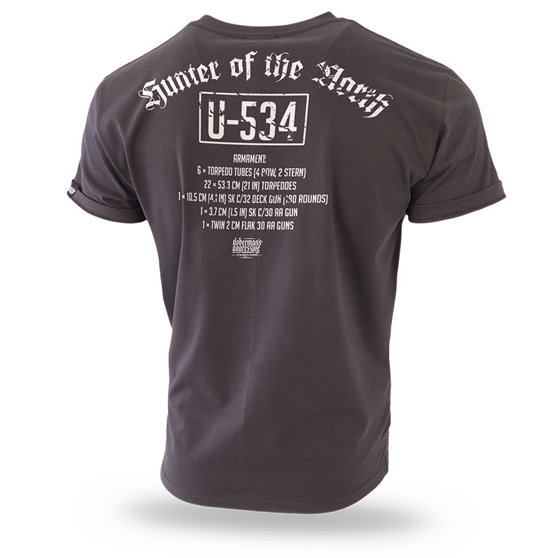 Koszulka wykonana z wysokiej jakości bawełny, zapewniająca wygodę i trwałość. Dodano gotycki napis Hunter Of The North. Na plecach to samo hasło w formie łuku, poniżej oznaczenie modelu okrętu z wyszczególnieniem jego uzbojenia. Wykorzystano różne rodzaje czcionek oraz efekt spękania nadruku. Koszulka w standardowym męskim fasonie, przy szyi wykończona praktycznym ściągaczem. Na rękawie niewielka czarna metka metka sygnowana logo marki Doberman's Aggressive. Model wyprodukowany ze stuprocentowej bawełny o masie 200g. Kolekcja historyczna.