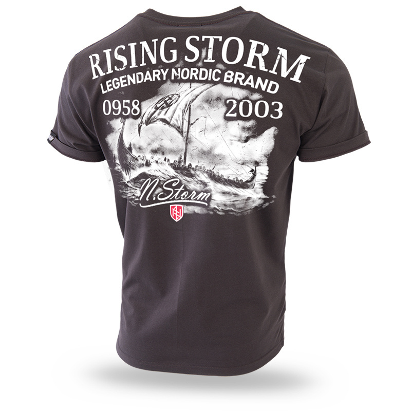 Bawełniany T-shirt z jednokolorowym nadrukiem utrzymanym w stylistyce nordyckiej. Standardowy męski fason koszulki z krótkim rękawem. Czerwone detale w postaci wewnętrznej lamówki oraz firmowej wszywki. Przy szyi ściągacz, na piersi niewielkie logo N.Storm. Na środku pleców wzór z motywem drakkara płynącego po wzburzonym morzu. Powyżej napisy: Rising Storm, Legendary Nordic Brand oraz liczby 0958 i 2003, poniżej aplikacja w postaci haftowanej naszywki. Haft w dwóch kolorach.