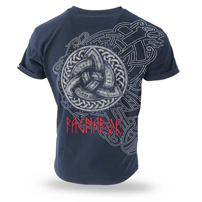 Standardowy fason koszulki, skład materiału to 100% bawełny o gramaturze 200g. Plecy koszulki są zadrukowane grafiką przedstawiającą celtyckie sploty oraz motywy skandynawskie. Na prawym barku koszulki napis Ragnarok.