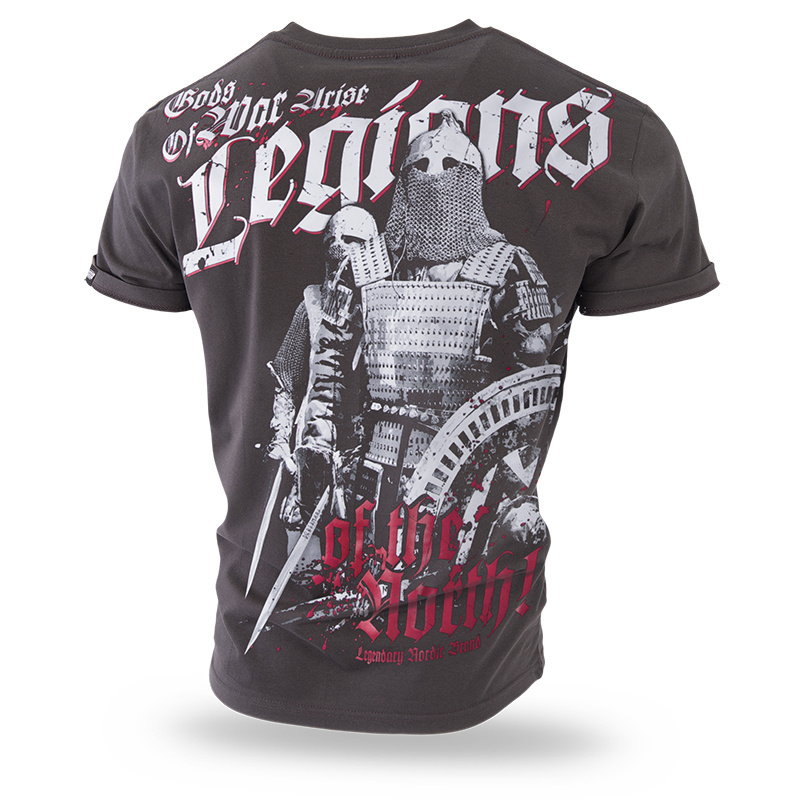 Klasyczna męska koszulka w prostym fasonie. Wykonana z wysokojakościowej bawełny o masie 200g. Pod szyją wykończona wąską plisą. Na lewym rękawie mała metka z firmowym logo. Z przodu, przy lewej krawędzi koszulki nadruk z dużym napisem Legion. Plecy niemal w całości zadrukowane. W centrum grafiki znajduje się dwóch wojowników w pełnym uzbrojeniu. Powyżej hasło Legions on the North. Wzór w dwóch kolorach.