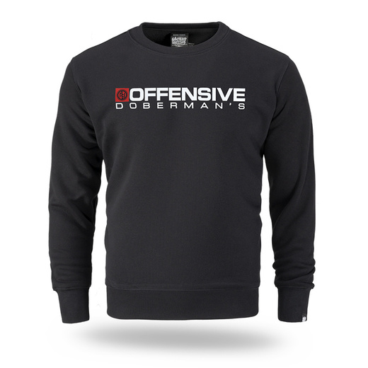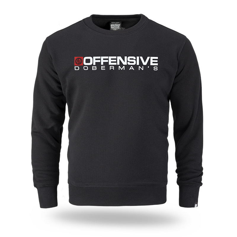 Wygodna bluza wykonana z wysokogatunkowej bawełny. Na lewym rękawie wszyta mała metka z logo marki. Dół bluzy oraz rękawów wykończone szerokim ściągaczem. Na przodzie bluzy znajduję się prosty napis OFFENSIVE z dopiskiem pod nim DOBERMANS. Całość wzoru uzupełnia symbol nordycki wpisany w kształt kwadratu.
