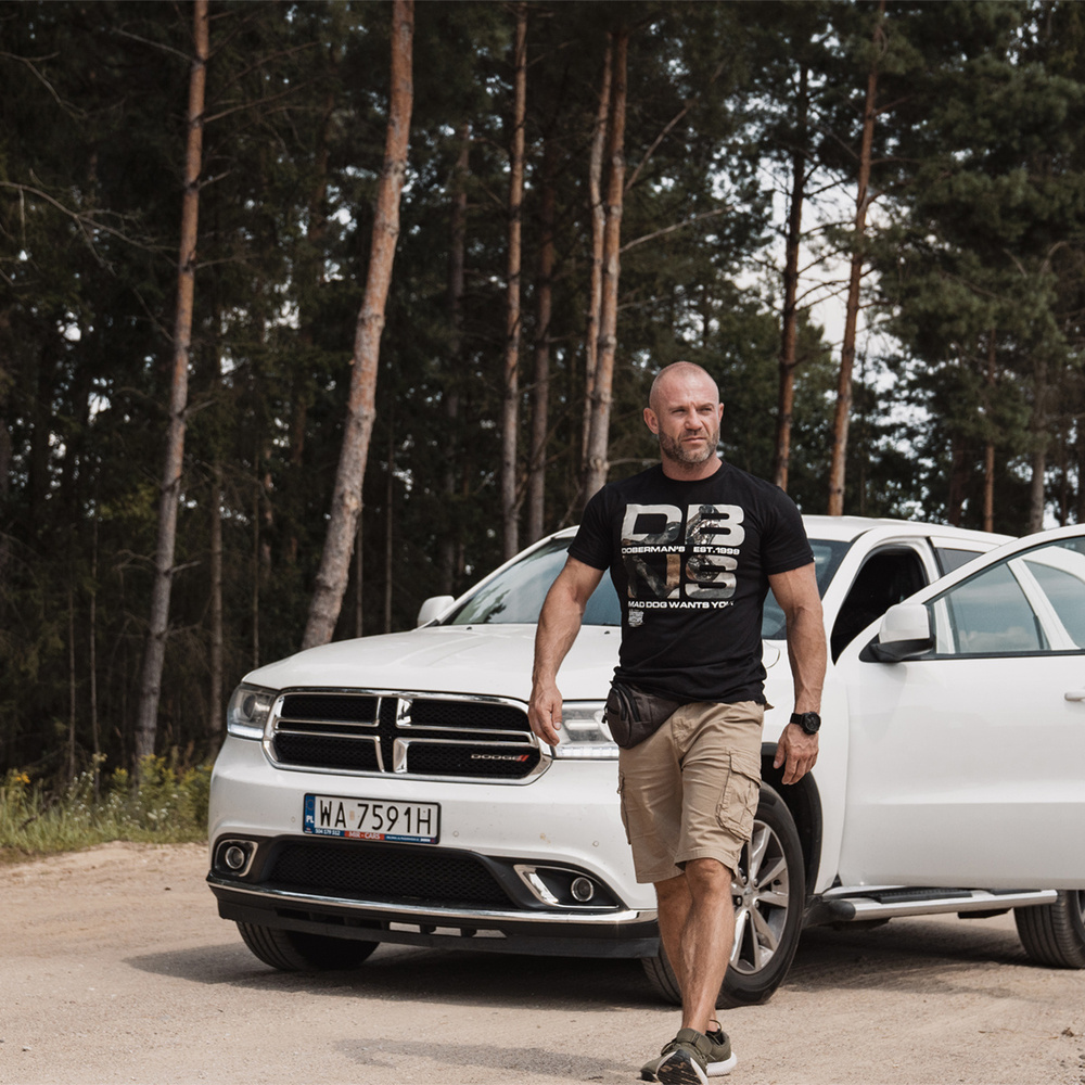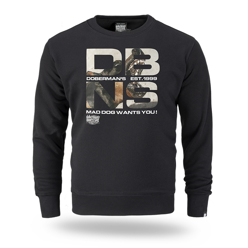 Wygodna bluza wykonana z wysokogatunkowej bawełny. Na lewym rękawie wszyta mała metka z logo marki. Dół bluzy oraz rękawów wykończone szerokim ściągaczem. Z przodu bluzy znajduję duży napis DBNS w który wkomponowana została grafika psa marki Doberman. Całość uzupełnia dopisek Mad Dog Wants You !
