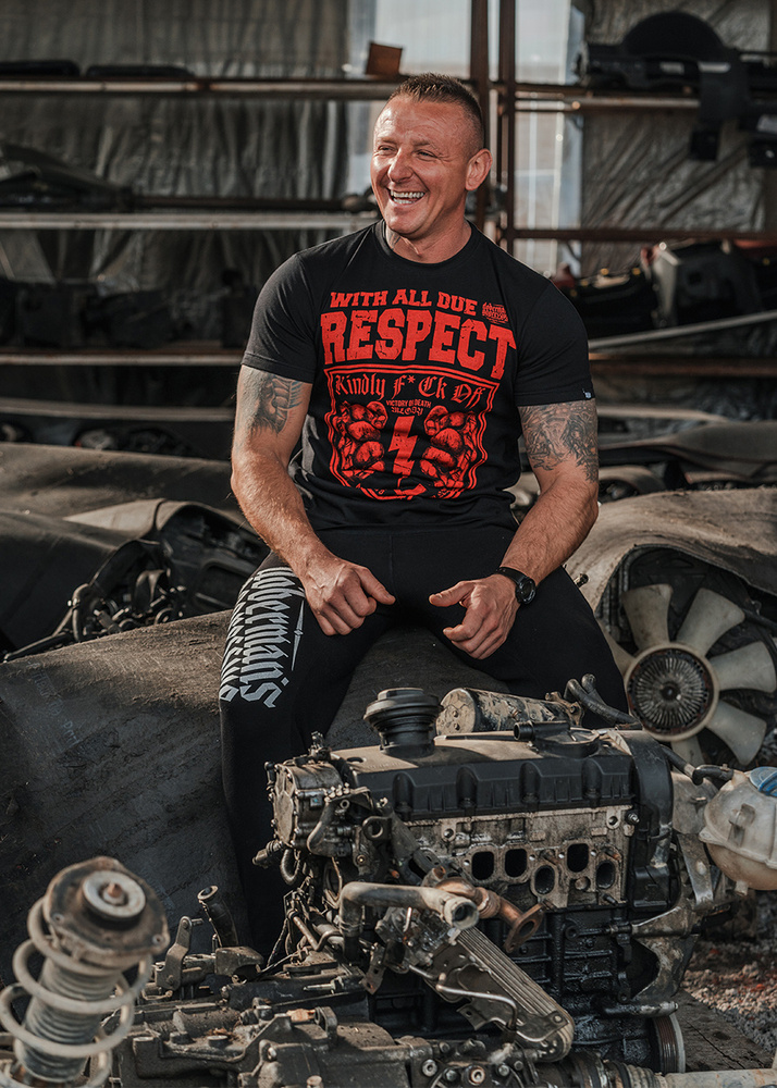 Wykonana z wysokiej jakości bawełny o gramaturze 320g. Na lewym rękawie wszyta mała metka z logo marki. Dół bluzy oraz rękawów wykończone szerokim ściągaczem. Z przodu bluzy znajduję się duży napis WITH ALL DUE RESPECT, poniżej zaciśnięte pięści z kastetem rozdzielone piorunem, nad nimi napis Kindly F*ck Off – całość zamknięta w kształcie tarczy.