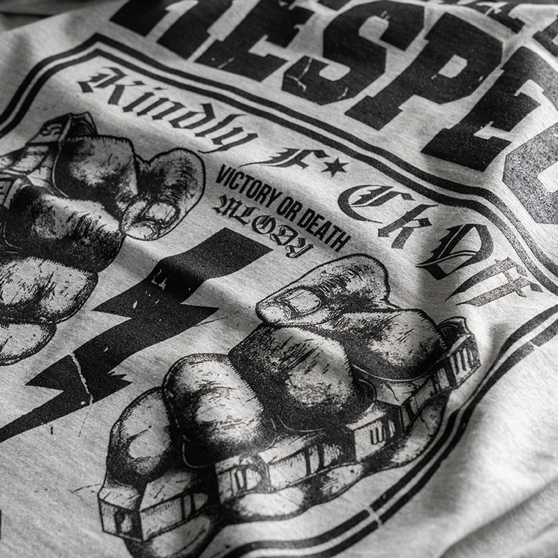 Wykonana z wysokiej jakości bawełny o gramaturze 320g. Na lewym rękawie wszyta mała metka z logo marki. Dół bluzy oraz rękawów wykończone szerokim ściągaczem. Z przodu bluzy znajduję się duży napis WITH ALL DUE RESPECT, poniżej zaciśnięte pięści z kastetem rozdzielone piorunem, nad nimi napis Kindly F*ck Off – całość zamknięta w kształcie tarczy.