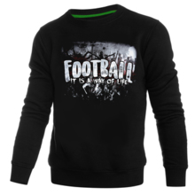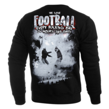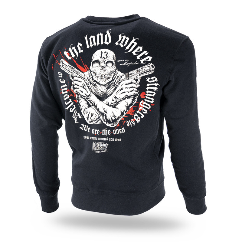 Wykonana z wysokiej jakości bawełny. Na lewym rękawie wszyta mała metka z logo marki. Dół bluzy oraz rękawów wykończone szerokim ściągaczem. Na plecach duży nadruk przedstawiający postać z głową czaszki trzymająca dwa pistolety. Dodatkowo napis „Welcome to the land where strangers die”. Na piersi podobna grafika w mniejszym rozmiarze.