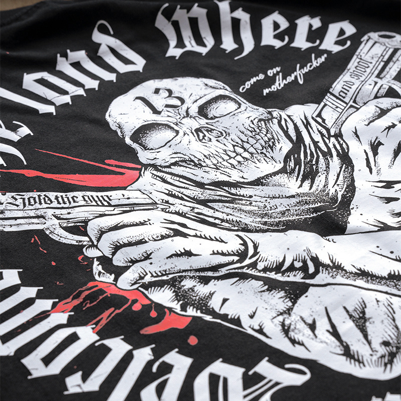 Wykonana z wysokiej jakości bawełny. Na lewym rękawie wszyta mała metka z logo marki. Dół bluzy oraz rękawów wykończone szerokim ściągaczem. Na plecach duży nadruk przedstawiający postać z głową czaszki trzymająca dwa pistolety. Dodatkowo napis „Welcome to the land where strangers die”. Na piersi podobna grafika w mniejszym rozmiarze.